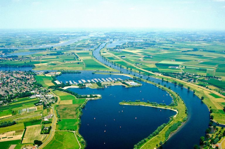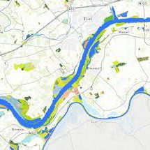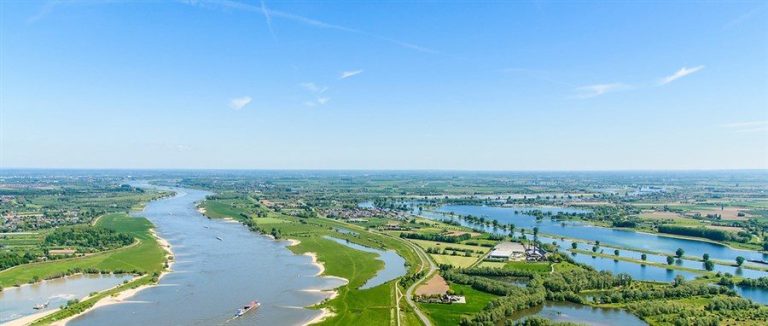 Hier de smalle strook land ter hoogte van het plaatsje Heerewaarden tussen de brede Waal en de smallere Maas.