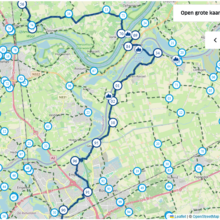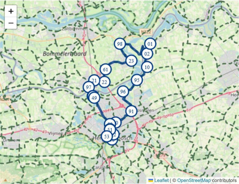 Ruw overzicht van het knooppuntenrondje vanuit Den Bosch, er zit 1 pontje over de Maas op deze route nabij Alem.