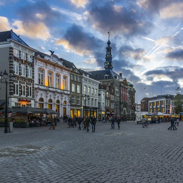 Sfeerimpressie op de Grote Markt in het centrum van Den Bosch. Vanuit dit plein gaan fietsroutes Brabant en Gelderland in.