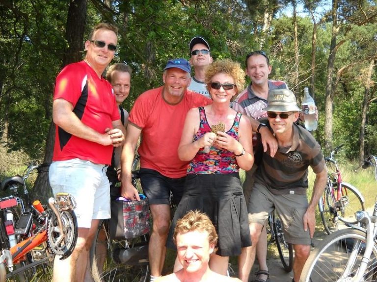 Halfverwege een zandpad in Brabant komen we op het idee om eens een groepsfoto te maken, we zijn ergens tussen Strijbeek en Chaam en iedereen is blij ondanks dat we nog wat kilometers door het rulle zand moeten fietsen voordat we weer op een verharde weg komen.